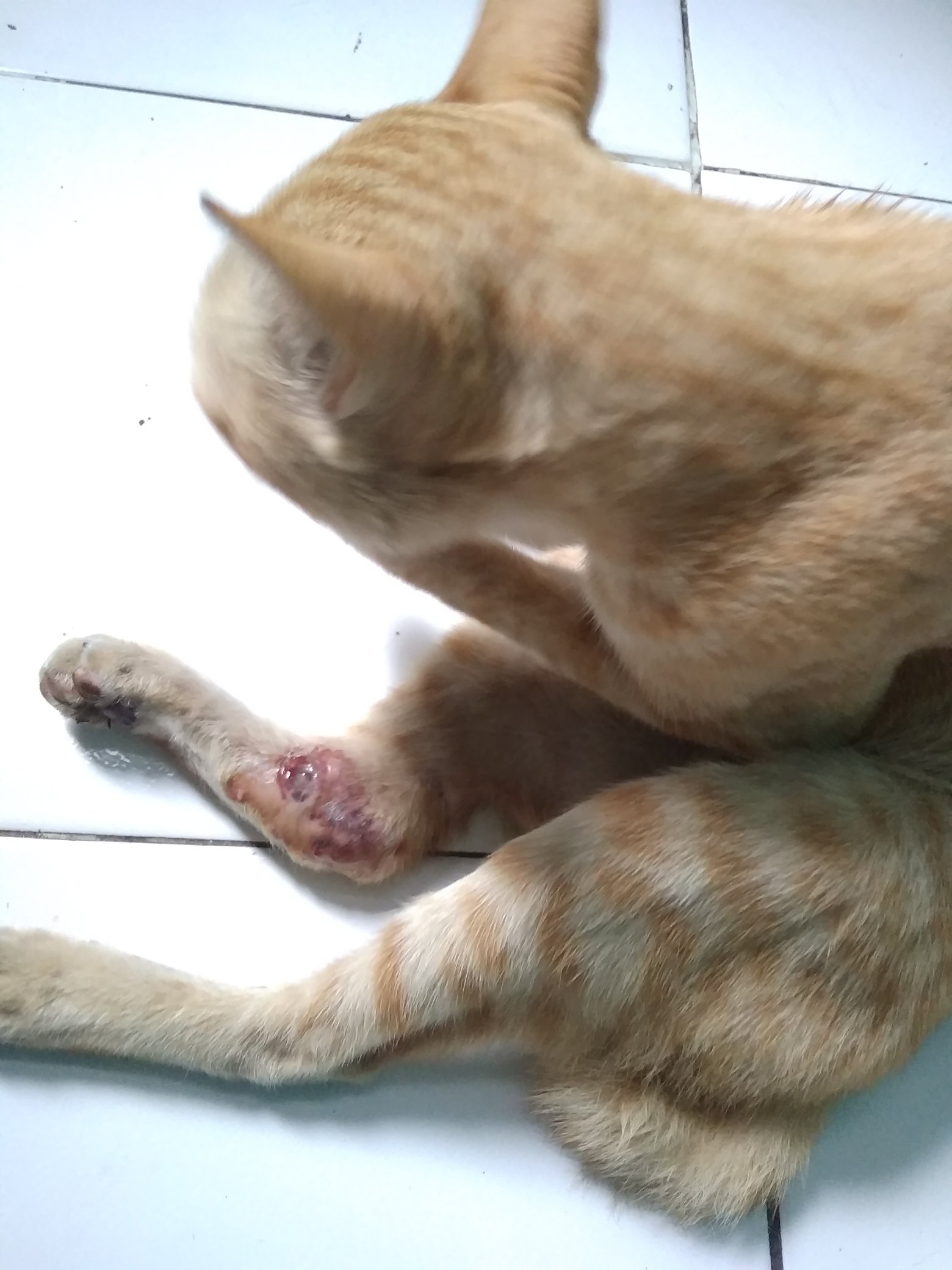 Dulu kucing saya selalu garu dan gatal sehingga berkurap. Dia kucing liar yang tidak pernah disentuh. Pastikan luka kucing bersih dari nanah sebelum diobati.