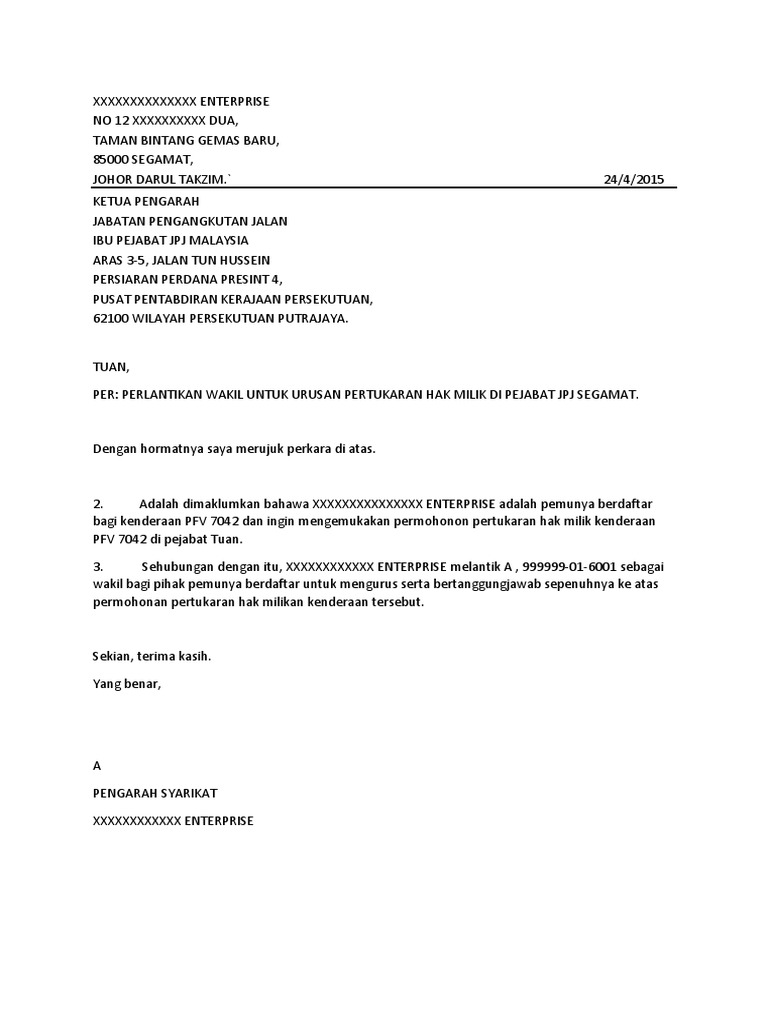 258 pm january 11 2012. Dapatkan geran asal dari syarikat kenderaan yang anda berurusan selepas selesai membuat pembayaran. Contoh surat wakil jpj 34wm1r2vd8l7.